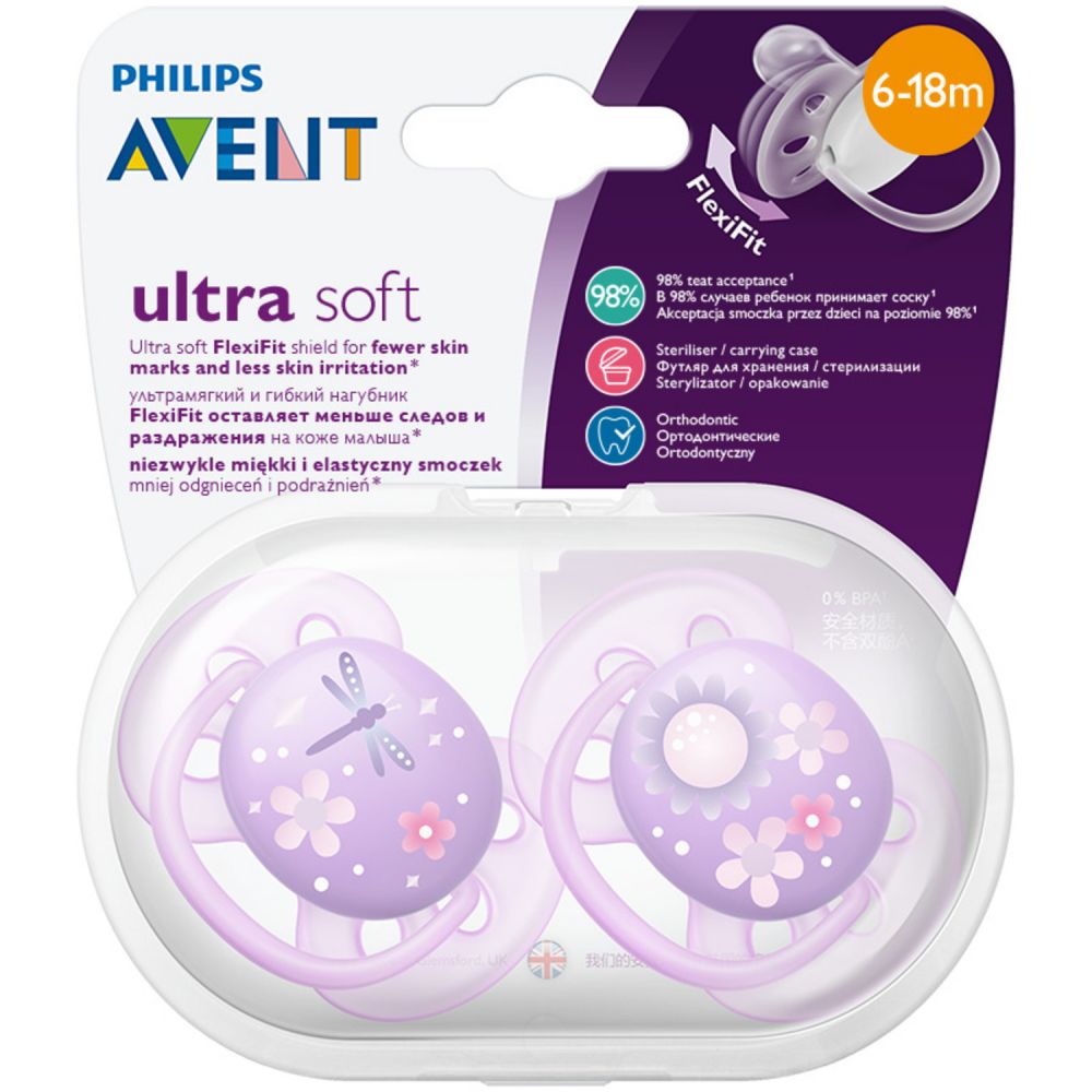 Позаботьтесь о нежной коже малыша, выбрав пустышку Philips Avent ultra soft*. Невероятно мягкий и гибкий нагубник повторяет естественные контуры лица, оставляя меньше следов и раздражения на коже малыша.**