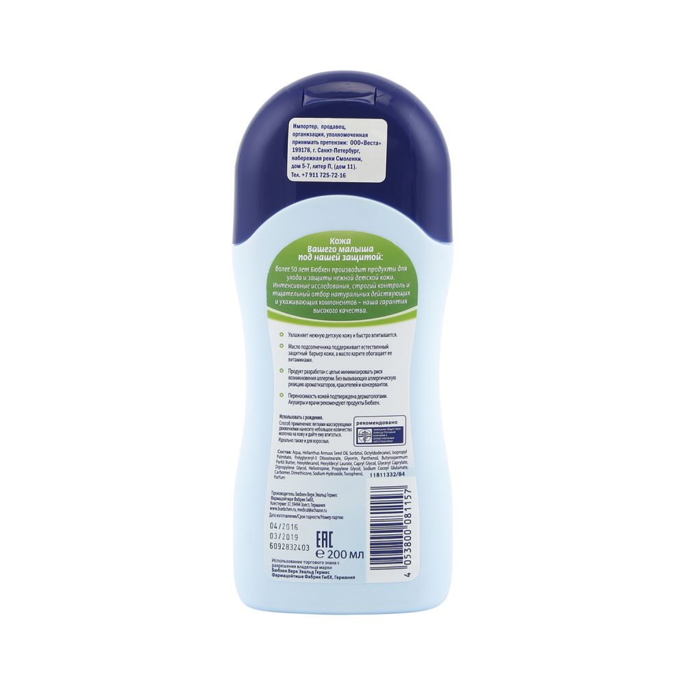 Молочко детское Bubchen (Бюбхен): содержит натуральные чистые масла карите и подсолнечника, которые оказывают антисептическое воздействие, питают и защищают кожу малыша; содержит натуральный экстракт ромашки, который способствует заживлению ран, оказывает противовоспалительное и успокаивающее действие на кожу; без консервантов и красителей; без парафина и ароматизаторов; без минеральных и эфирных масел; протестировано и одобрено дерматологами.Форма выпуска