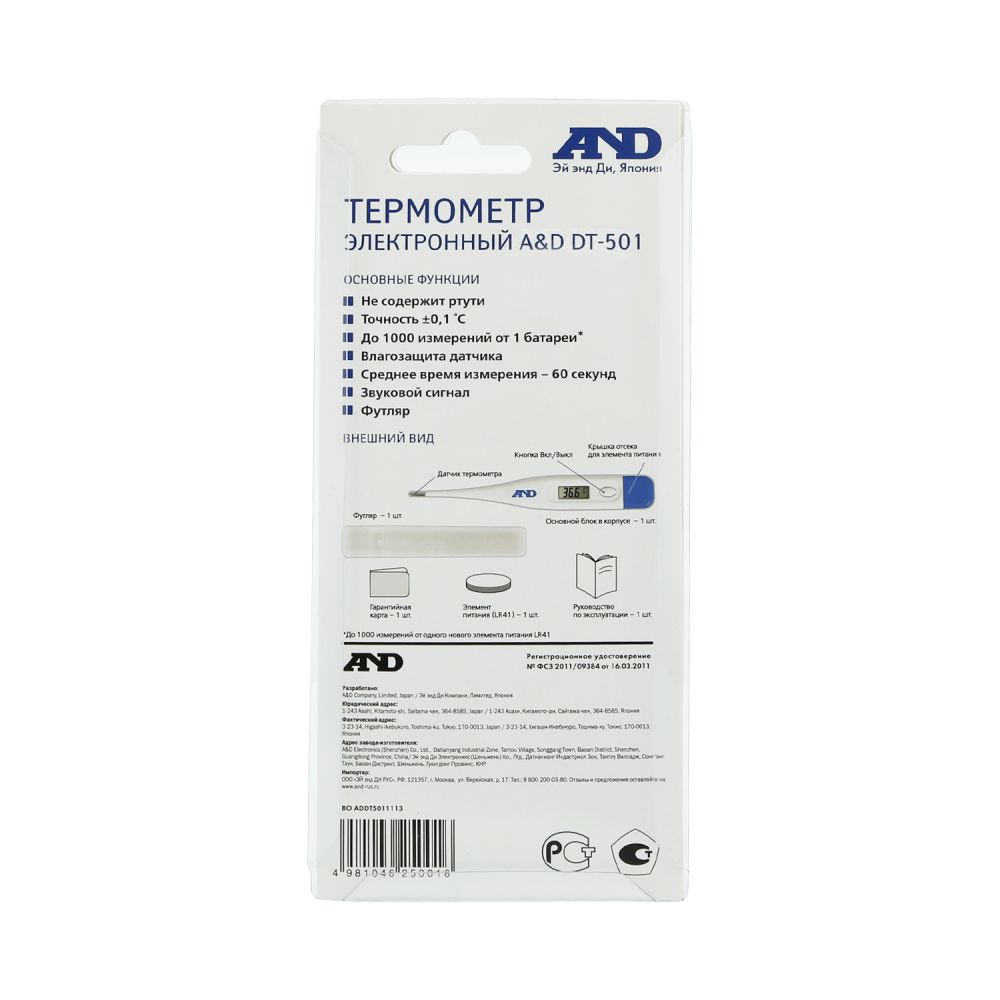 Электронный термометр (или градусник) AND DT-501 предназначен для измерения температуры тела человека тремя способами: орально, в подмышечной впадине (аксиллярно) или ректально. Время измерения около 60 сек.
