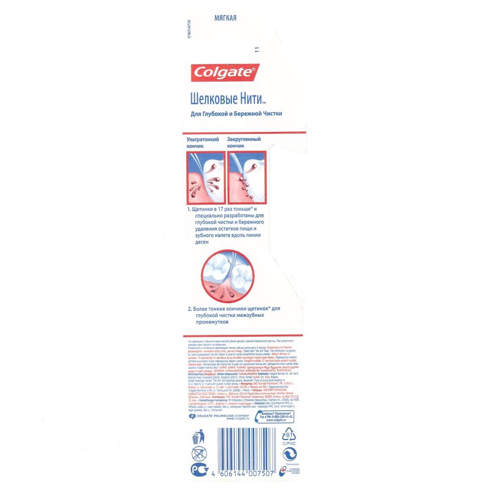 Зубная щетка Colgate Шелковые Нити разработана специально для людей, нуждающихся в особенно тщательном и бережном удалении зубного налета.Зубная щетка Colgate Шелковые Нити с ультратонкими мягкими щетинками эффективно удаляет зубной налет вдоль линии десны и из межзубных промежутков для тщательного и бережного очищения полости рта. Рекомендована людям при воспалении и кровоточивости десен, а также для предотвращения дальнейшего появления проблем с деснами и поддержания их здоровья.Особые указания