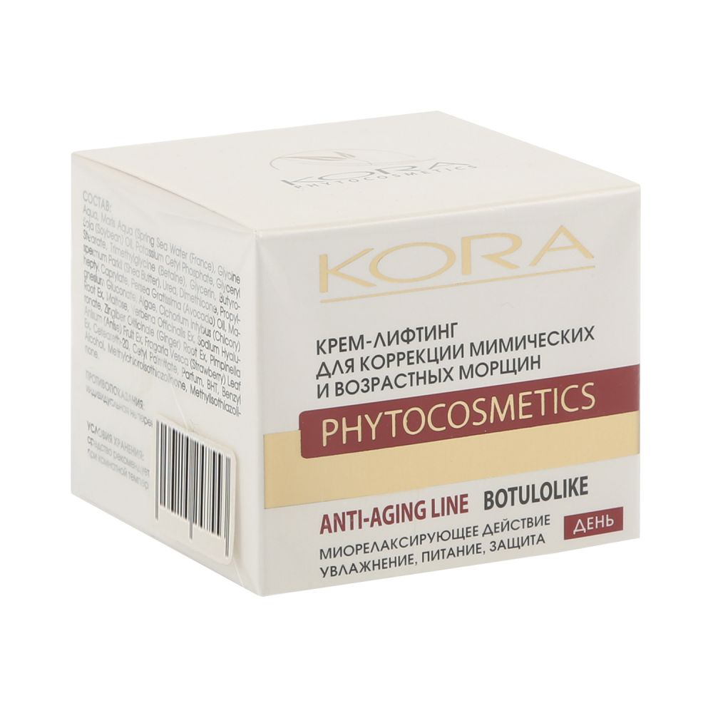 Крем-лифтинг для коррекции мимических морщин KORA разработан для зрелой кожи и рекомендуется к применению после 30 лет.Лифтинг-эффект, коррекция овала лица, уменьшение неровностей кожи.Комплекс растительных миорелаксантов снимает напряжение мышц лица, укрепляет овал и делает морщины менее заметными.Экстракт морских водорослей и полисахариды цикория моделируют овал лица и повышают упругость кожи. Вербена препятствуетобразованию новых морщин и разглаживает существующие. Термальная вода и суперувлажняющий комплекс поддерживают оптимальный гидробаланс в клетках эпидермиса и увеличивают их защитные свойства.Показания к применению