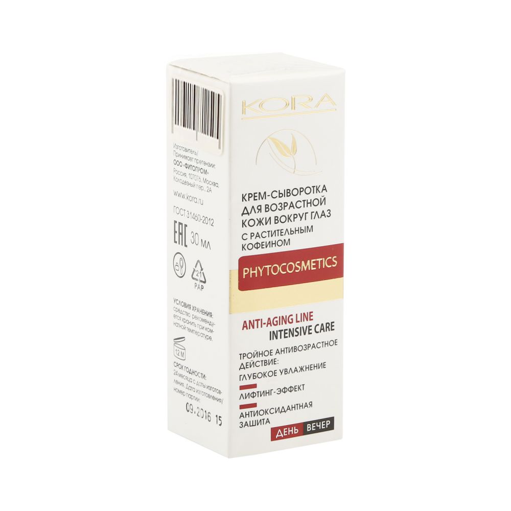 Крем сыворотка для кожи вокруг глаз одно из самых эффективных средств по уходу для сверхчувствительной, очень нежной кожи. Косметический продукт применяется для интенсивного увлажнения, питания, антиоксидантной защиты кожного покрова. Включение сыворотки в программу ухода позволяет предотвратить преждевременное старение дермы, отсрочить появление глубоких морщин, иных возрастных проблем.Профессиональный крем от морщин для кожи вокруг глаз рекомендован к ежедневному применению на протяжении минимум 60 дней. По необходимости курс можно повторить. Особенностью крема-сыворотки является выраженный пролонгированный эффект. ДЕЙСТВИЕ: В магазине КОРА купить сыворотку для кожи вокруг глаз можно в качестве основного, дополнительного косметического средства курсовой программы ухода за веками. Косметическое средство обладает тройным эффектом. Крем-сыворотка омолаживает эпидермис (оказывает лифтинговое действие), защищает, увлажняет кожный покров.В составе косметического средства сочетаются кофеин, ферменты, белки, пептиды. Такой коктейль создан для эффективной борьбы со старением кожи. Сыворотка стимулирует синтез коллагена, укрепляет волокна эластина, сокращает количество, глубину кожных складок. В результате взгляд становится моложе, более открытым. Предупреждается проблема нависания верхних век, появления отеков нижних.Сыворотка выравнивает цвет лица. При курсовом применении продукта заметно уменьшаются синяки, отечность. Нежная кожа век становится сияющей, подтянутой, гладкой.Противопоказания