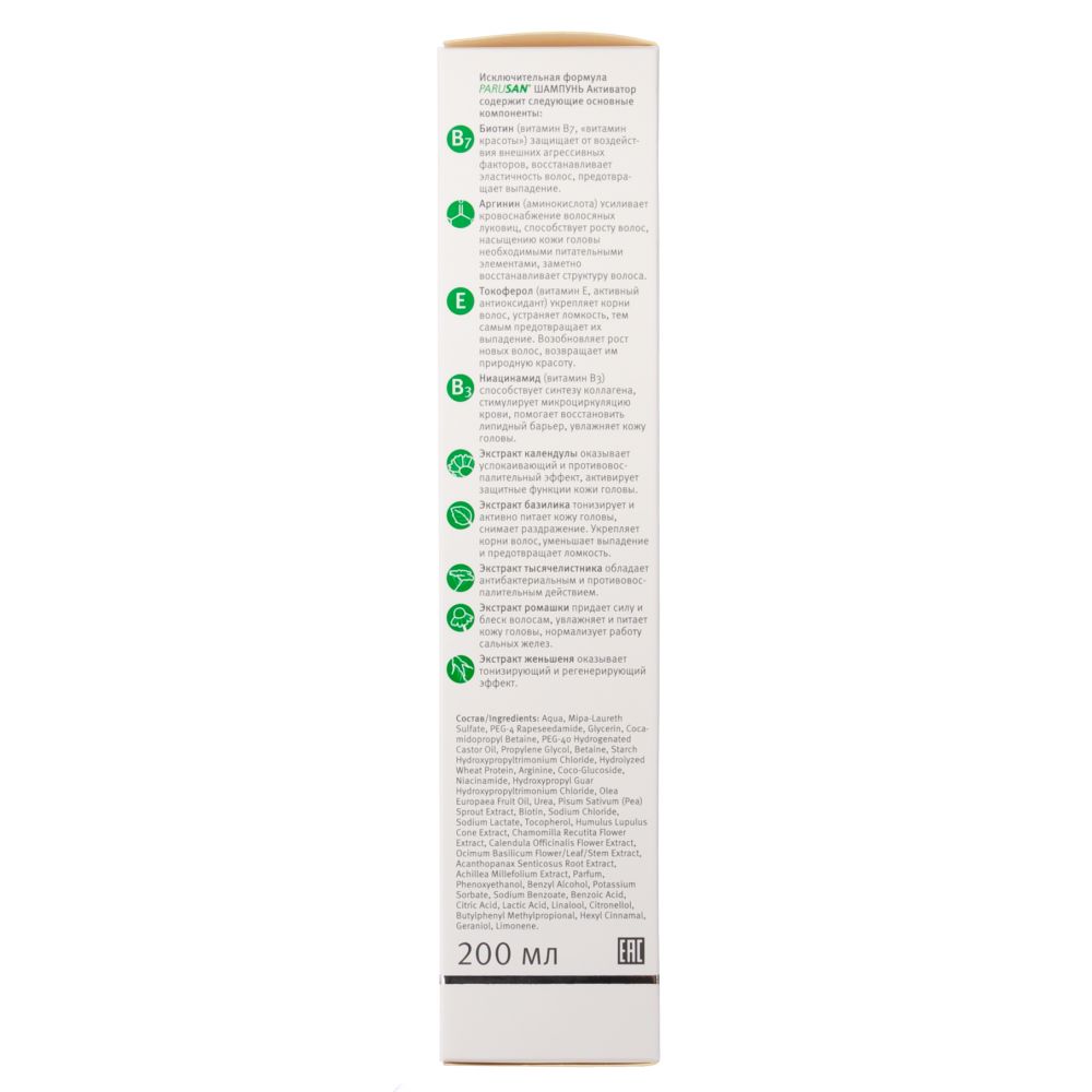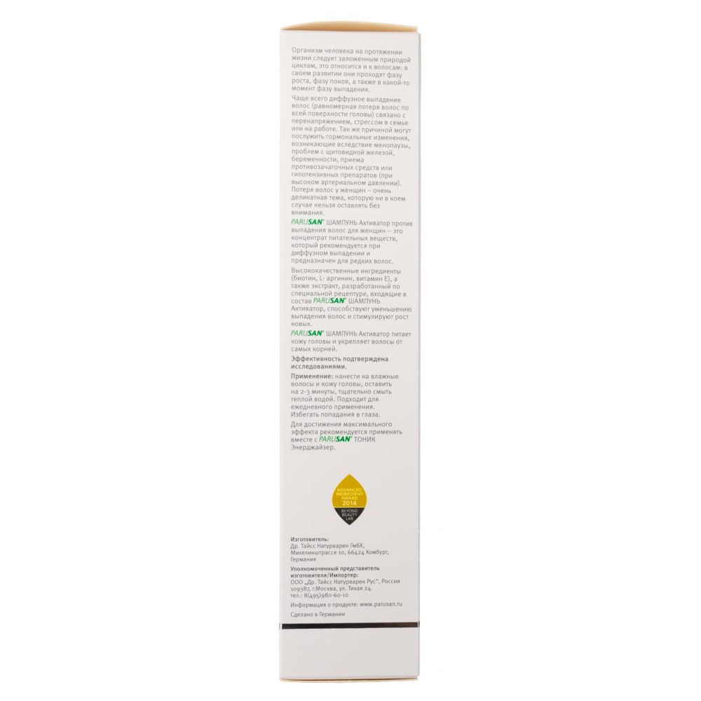 PARUSAN ШАМПУНЬ Активатор против выпадения волос для женщин это концентрат питательных веществ, который рекомендуется при диффузном выпадении и предназначен для редких волос._x000D_PARUSAN ШАМПУНЬ Активатор:_x000D_предотвращает выпадение и стимулирует рост волос_x000D_улучшает кровообращение кожи головы_x000D_питает и увлажняет кожу головы_x000D_Исключительная формула PARUSAN ШАМПУНЬ Активатор содержит следующие основные компоненты:_x000D_Биотин (витамин В7, «витамин красоты») защищает от воздействия внешних агрессивных факторов, восстанавливает эластичность волос, предотвращает выпадение._x000D_Аргинин (аминокислота) усиливает кровоснабжение волосяных луковиц, способствует росту волос, насыщению кожи головы необходимыми питательными элементами, заметно восстанавливает структуру волоса._x000D_Токоферол (витамин Е, активный антиоксидант) укрепляет корни волос, устраняет ломкость, тем самым предотвращает их выпадение. Возобновляет рост новых волос, возвращает им природную красоту._x000D_Ниацинамид (витамин В3) способствует синтезу коллагена, стимулирует микроциркуляцию крови, помогает восстановить липидный барьер, увлажняет кожу головы._x000D_Экстракт календулы оказывает успокаивающий и противовоспалительный эффект, активирует защитные функции кожи головы._x000D_PARUSAN ШАМПУНЬ Активатор дополнительно обогащен растительными экстрактами: Экстракт базилика тонизирует и активно питает кожу головы, снимает раздражение. Укрепляет корни волос, уменьшает выпадение и предотвращает ломкость. Экстракт тысячелистника обладает антибактериальным и противовоспалительным действием. Экстракт ромашки придает силу и блеск волосам, увлажняет и питает кожу головы, нормализует работу сальных желез. Экстракт женьшеня оказывает тонизирующий и регенерирующий эффект. Для достижения максимального эффекта рекомендуется применять вместе с основой комплекса PARUSAN ТОНИК Энерджайзер.Показания к применению