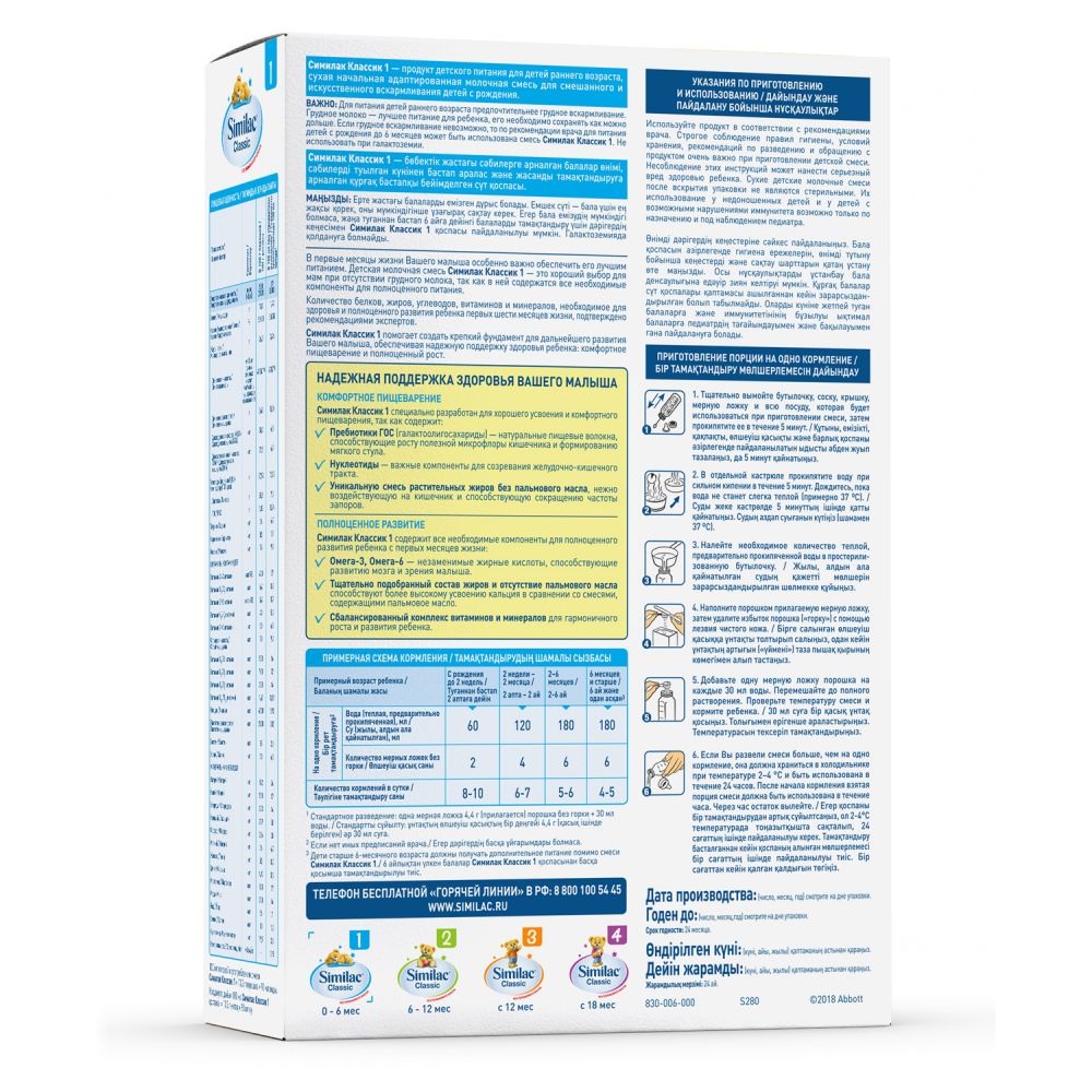 Симилак Классик 1 специально разработан для хорошего усвоения и комфортного пищеварения, так как содержит: пребиотики ГОС (галактоолигосахариды) - натуральные пищевые волокна, способствующие росту полезной микрофлоры кишечника и формированию мягкого стула; нуклеотиды - важные компоненты для созревания желудочно-кишечного тракта; уникальную смесь растительных жиров без пальмового масла, нежно воздействующую на кишечник и способствующую сокращению частоты запоров. Силак Классик 1 содержит все необходимые компоненты для полноценного развития ребенка с первых месяцев жизни: Омега-3, Омега-6 - незаменимые жирные кислоты, способствующие развитию мозга и зрения малыша; тщательно подобранный состав жиров и отсутствие пальмового масла способствуют более высокому усвоению кальция; сбалансированный состав витаминов и минералов для гармоничного развития и роста развития ребенка.С осторожностью (Меры предосторожности)