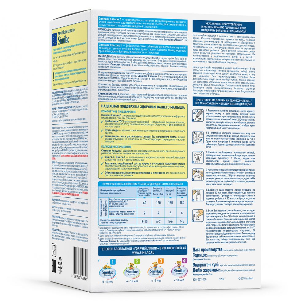 Симилак Классик 1 специально разработан для хорошего усвоения и комфортного пищеварения, так как содержит: пребиотики ГОС (галактоолигосахариды) - натуральные пищевые волокна, способствующие росту полезной микрофлоры кишечника и формированию мягкого стула; нуклеотиды - важные компоненты для созревания желудочно-кишечного тракта; уникальную смесь растительных жиров без пальмового масла, нежно воздействующую на кишечник и способствующую сокращению частоты запоров. Силак Классик 1 содержит все необходимые компоненты для полноценного развития ребенка с первых месяцев жизни: Омега-3, Омега-6 - незаменимые жирные кислоты, способствующие развитию мозга и зрения малыша; тщательно подобранный состав жиров и отсутствие пальмового масла способствуют более высокому усвоению кальция; сбалансированный состав витаминов и минералов для гармоничного развития и роста развития ребенка.Особые указания
