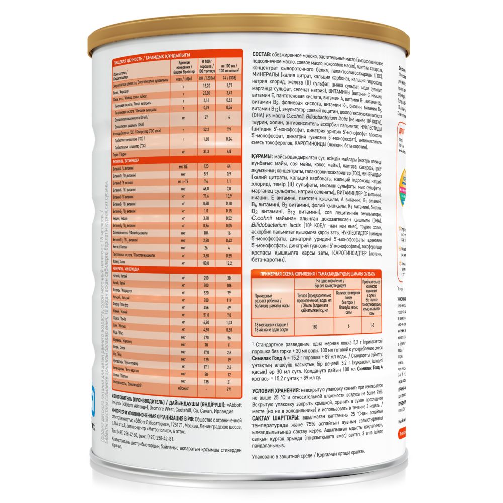 обезжиренное молоко, растительные масла (высокоолеиновое подсолнечное масло, соевое масло, кокосовое масло), лактоза, сахароза, концентрат сывороточного белка, галактоолигосахариды (ГОС), МИНЕРАЛЫ (калия цитрат, кальция карбонат, кальция гидроксид, натрия хлорид, железа (II) сульфат, цинка сульфат, меди сульфат, марганца сульфат, селенат натрия), ВИТАМИНЫ (витамин C, ниацин, витамин Е, пантотеновая кислота, витамин А, витамин В1, витамин В6, витамин В2, фолиевая кислота, витамин К1, биотин, витамин D3, витамин В12), эмульгатор соевый лецитин, докозагексаеновая кислота (DHA) из масла C.cohnii, Bifidobacterium lactis (не менее 106 КОЕ/г), таурин, холин, антиокислитель аскорбил пальмитат, НУКЛЕОТИДЫ (цитидин 5’-монофосфат, динатрия уридин 5’-монофосфат, аденозин 5’-монофосфат, динатрия гуанозин 5’-монофосфат), антиокислитель смесь токоферолов, КАРОТИНОИДЫ (лютеин, бета-каротин).